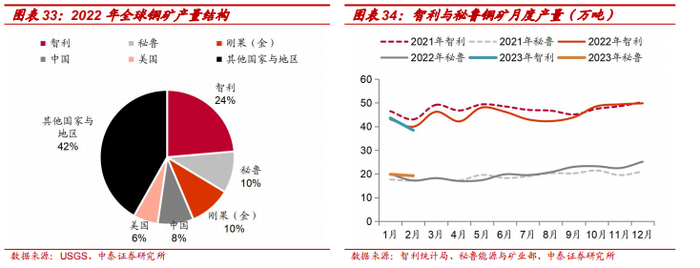 全球铜矿供给主要集中在秘鲁和智利。根据USGS,2022年智利与秘鲁的铜矿产量在全球产量中的占比分别为23%与10%,2022年智利和秘鲁由于疫情原因直接影响全球铜矿供给。