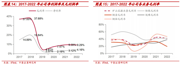 公司矿山业务盈利能力较强。2022公司毛利率为9.29%,同比-0.10pcts;净利率为4.16%,同比+1.04pcts,公司盈利能力进一步增强。19年毛利率大幅下降主要系公司收购IXM金属贸易公司所致。并表后新增贸易板块营收贡献大但整体毛利率低,19年贸易业务毛利率为-3.01%拉低综合毛利率,2020年后贸易板块毛利率逐渐提升并稳定在3.5%左右。矿山业务是公司主要的盈利贡献来源,2020-2022毛利率分别为26.49%/44.27%/41.62%,毛利率与金属价格呈现出较强的相关性,伴随金属价格走强,有望进一步增厚公司利润。