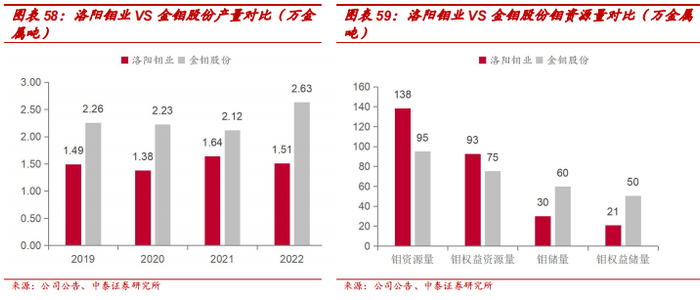 公司主要运营三道庄钼钨矿区和合营企业所属的上房沟钼铁矿区,主要从事钼、钨金属的采选、冶炼、深加工、科研等,拥有采矿、选矿、冶炼、化工等上下游一体化业务,主要产品包括钼铁、仲钨酸铵、钨精矿及其他钼钨相关产品。合计具有钼资源量138万吨,权益资源量93万吨;钨资源量12万吨。23年规划钼产量1.20-1.50万吨,钨产量0.65-0.75万吨。