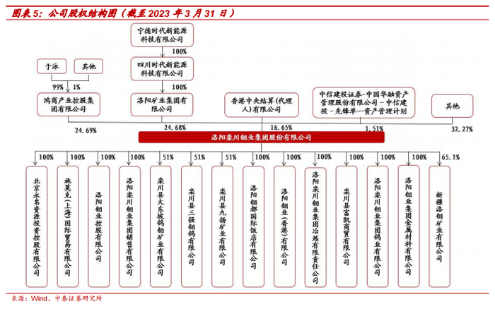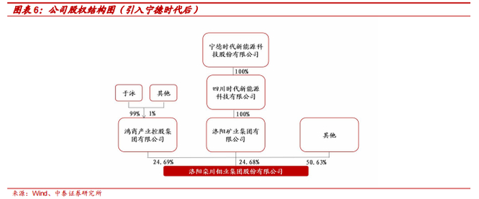 引入宁德时代,有望提升在能源金属领域布局的战略协同效应。公司原第二大股东为洛阳矿业集团有限公司,持股比例为 24.68%,2022年 10 月洛阳矿业上层控股股东洛阳国宏以持有公司的 24.68%股份对宁德时代控股子公司四川时代增资,增资完成后四川时代直接控股洛阳矿业 100%股权从而间接取得公司 24.68%股权,此次增资完成后有望进一步提升宁德时代与公司在能源金属领域布局的战略协同。宁德时代与洛阳钼业合资公司中标玻利维亚 Uyuni 和 Oruro 盐湖提锂项目。