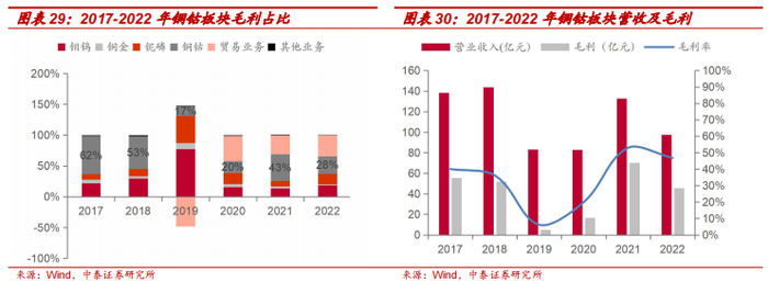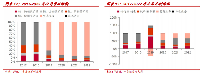 “矿山采掘业务+贸易业务”双轮驱动。近年公司由单一的钨钼板块逐渐发展至铜钴、钨钼、铌磷、铜金及贸易五大板块,业务逐步多元化。从收入占比来看,2022年公司贸易业务占比为85%,矿山采掘及加工业务占比15%。具体来看,2022公司铌磷板块营收约74亿元,同比+44%;钼钨板块营收约70亿元,同比+30%;铜金板块营收约13亿元,同比-22%;铜钴板块实现营收约97亿元,同比-27%;公司矿业贸易板块实现营收约1473亿元,与2021年基本持平。未来伴随刚果金铜钴项目进一步放量,公司营收有望再上一个台阶。