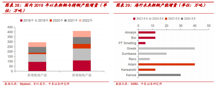 但粗炼产能增长有限,致使铜精矿无法有效转化为精炼铜。由于国内近两年粗炼产能项目相对有限,2018年以来国内粗炼产能增量明显低于精炼产能增量。在冷料持续紧张的局面下,或将导致没有充足的粗炼产能将新增的铜精矿有效地转化为精炼铜,从而影响电解铜的供给。