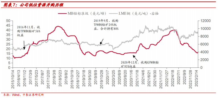 管理层经验丰富,强矿产资源并购能力。公司管理层拥有多年海内外投资并购经验,2016年11月,公司以26.5亿美元收购TFM铜钴矿56%权益,并于2019年1月以4.7亿美元对价再收购TFM矿24%权益,合计持有TFM铜钴矿80%权益;2020年12月,公司又以5.5亿美元对价收购KFM铜钴矿95%权益;此外还先后完成了对巴西铌磷资产以及IXM的收购。回顾历史来看,几次并购时点均处于商品价格以及矿产资源估值的低位。