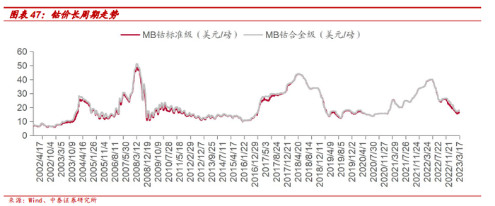 钴价跌至历史底部区间。截至 2023 年 2 月 15 日,MB 钴(标准级)跌至 16.35 美元/磅,MB 钴(合金级)跌至 17.43 美元/磅,已经跌至历史底部区间位置(2019 年价格最低点为 12.43 美元/磅、2016 年价格最低点为 10.30 美元/磅),中间品折扣系数跌至 53%-55%,当前价格已经接近刚果金手抓矿成本,向下空间有限。