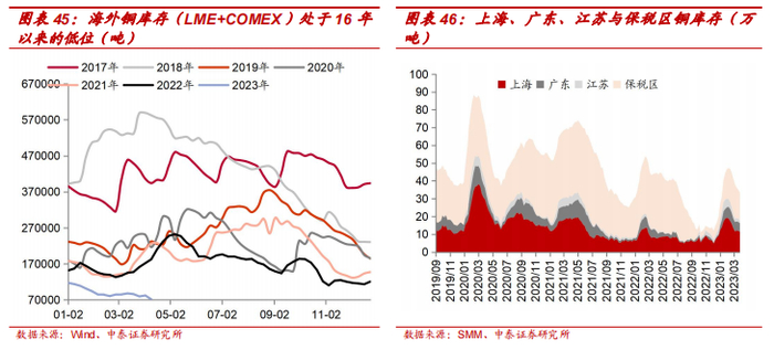 全球铜库存处于历史低位。2022年年初至今,全球库存不断走低,并创出历史新低。截至4月14日,LME与COMEX铜库存为7.18万吨,处于2016年以来的低位。国内库存方面,截至4月14日,上海、广东、江苏三地总库存17.73万吨,三省社会库存同比增加33.81%;保税区库存15.58万吨,保税区库存同比减少49.76%,国内铜库存亦处于历史底部。