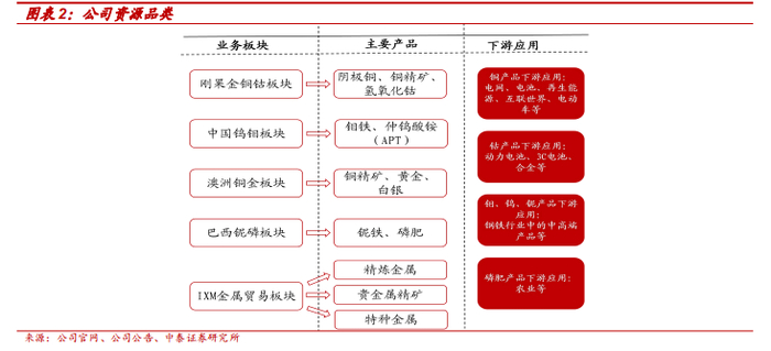 资产逐步形成多样化、全球化布局。公司资源品种覆盖了基本金属、特种金属和贵金属。产品下游应用领域与能源转型和工业升级领域紧密相关,同时通过磷介入农业应用领域,公司产品主要应用领域包括电网、动力电池、3C电池、合金、再生能源、互联世界、电动车、农业等。公司目前已经形成铜钴、钨钼、铜金、铌磷以及金属贸易五大业务板块,业务分布于亚洲、非洲、南美洲、大洋洲和欧洲五大洲: