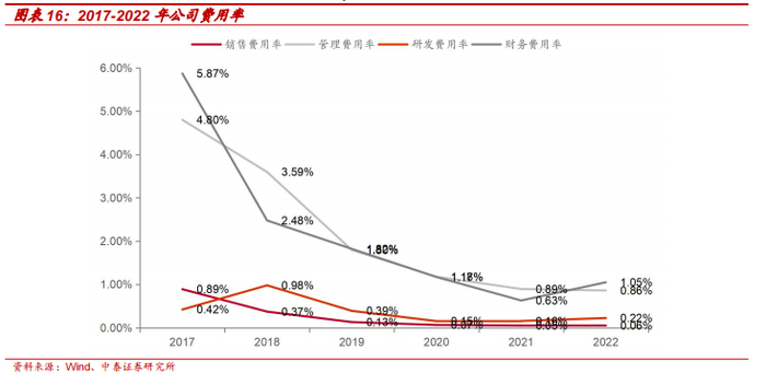精益生产及管理,费用率走低。2017-2022期间费用率整体呈现下降态势。2018年以后公司管理费用率显著下降,主要系根据财政部新财务报表格式要求将研发费用单独列示所致。2022公司期间费用率为2.19%,同比+0.46cts,主要由财务费用率和研发费用率上涨导致,具体来看:财务费用率为1.05%,同比+0.42cts;研发费用率为0.22%,同比+0.07pcts;管理费用率为0.86%;销售费用率为0.06%。