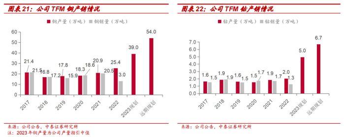 2023年是公司“提升年”,实现资源优势向产量优势的转变。公司拥有TFM和KFM两座优质的铜钴矿,钴资源量超越嘉能可位居全球第一位。目前正在进行TFM混合矿和KFM铜钴矿开发项目,TFM混合矿预计于23年下半年投产,建成后将新增铜金属产能20万吨/年、钴金属量产能1.7万吨/年;KFM铜钴矿预计于今年二季度投产,建成后将新增铜金属产能9万吨/年、钴金属量产能3万吨/年。全部投产后,公司刚果金板块将具备铜产能54万吨以上+钴产能6.7万吨,规划2023年铜产量36-42万吨、钴产量4.5-5.4万吨,较2022年实现翻倍增长。