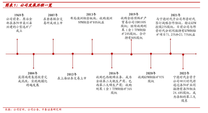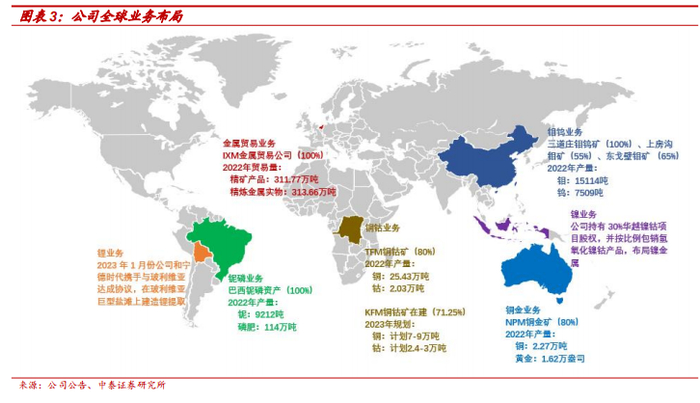 全球布局的综合性矿业巨头。公司于2007年和2012年分别完成港股和A股上市,上市后公司开启海内外资产收并购,资源储量及产量迅速扩张。当前公司形成了“矿山+贸易”发展模式,逐渐成为全球第一大钴生产商,第二大铌生产商,领先的钨、钼生产商和重要的铜生产商,亦是巴西第二大磷肥生产商,同时公司基本金属贸易业务位居全球前三。