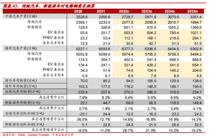 新能源车也将继续拉动全球用铜需求。根据 Ducker Frontier,我们假设传统汽车、EV 乘用车、PHEV 乘用车与客车及专用车的单车用铜量分别为25.0、60.0、83.0、200.0 千克,预计 2023-2024 年全球汽车对电解铜的需求量约为 286.8.0 万吨/310.0 万吨,其中新能源车需求量 90.5 万吨/116.9万吨。