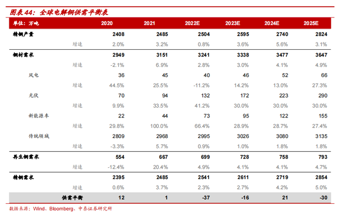 供需继续错配,铜价已然处于景气周期。供给端,随着海外矿山产能逐步释放,我们预计2023年精铜产量为2595万吨,同比增速为3.6%,其中值得关注的是冷料供应不足,以及矿山资源保护引发的罢工事件等或将对供给端形成的扰动。需求端,我们认为2023年风电、光伏、新能源车用铜需求分别增长14.2%、30.0%、28.9%,预计2023年全球精铜需求量为2611万吨。综合来看,我们预计2023年精铜仍有-15.8万吨的缺口,供需仍处于偏紧格局。