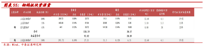 1)三道庄钼钨矿:公司持股100%,于2021年11月18日换发三道庄钼钨矿采矿许可证,矿区面积2.0031平方公里,钼资源量约25.73万吨+钨资源量11.61万吨,生产规模1263万吨/年。