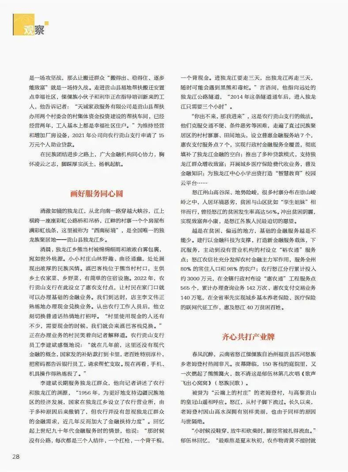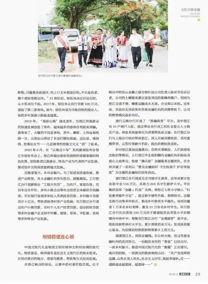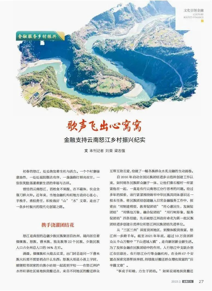 滚滚怒江水,深深金融情。在云岭大地,经过各家金融机构的共同努力,一份脱贫攻坚的“答卷”已经交付,一曲乡村振兴、推进中国式现代化的“新篇”正在谱写。离开的时候,一首清亮的歌曲响彻山谷:“共产党光辉照边疆,山笑水笑人欢乐。社会主义好哎,架起幸福桥。哎……道路越走越宽阔,越宽阔……”