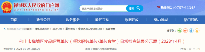 中国质量新闻网讯 近日,广东省佛山市禅城区人民政府网站发布佛山市禅城区食品经营单位(餐饮服务单位/单位食堂)日常检查结果公示表(2023年4月)。