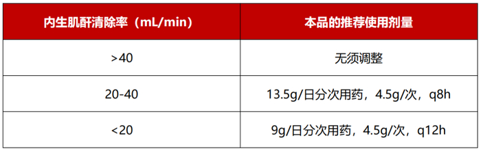 肾功能不全患者(肌酐清除率≤40mL/min)或者血液透析患者,应当根据实际的肾功能损害程度调整本品静脉用药的剂量和间隔时间。肾功能不全患者使用本品的每日推荐剂量如下: