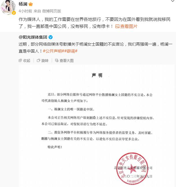 5月10日,阳光媒体集团官微发布声明,辟谣网传的有关杨澜国籍的不实言论:“我们再强调一遍,杨澜一直是中国人!”