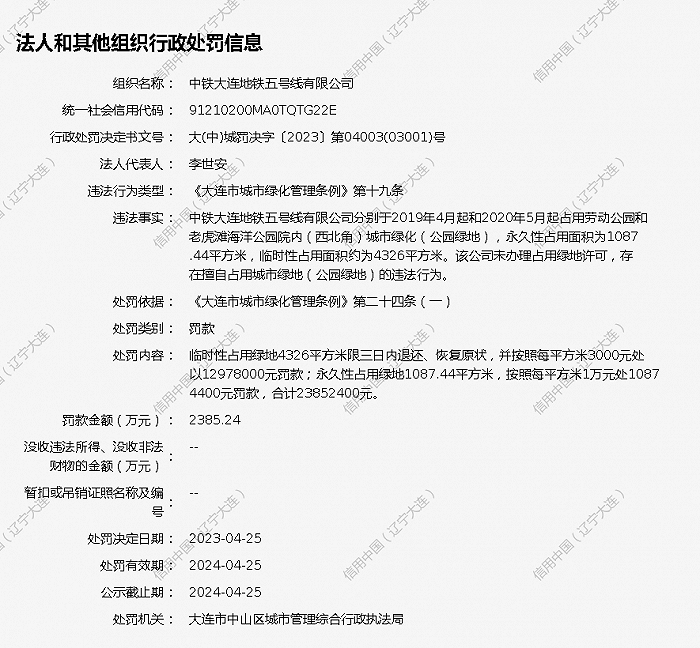 界面新闻从信用中国 ( 辽宁大连 )网站了解到,中铁大连地铁五号线有限公司4月25日因擅自占用城市绿地(公园绿地)的违法行为,被大连市中山区城市管理综合行政执法局罚款2385.24万。