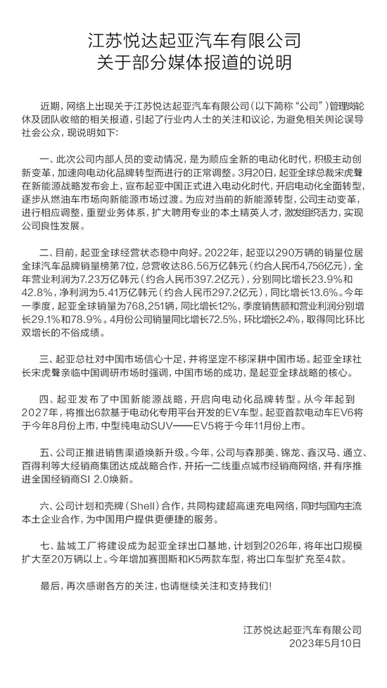 5月10日下午,悦达起亚发布说明表示,此次公司内部人员的变动情况,是为顺应全新的电动化时代,积极主动创新变革,加速向电动化品牌转型而进行的正常调整。并表示将扩大聘用专业的本土精英人才,激发组织活力。