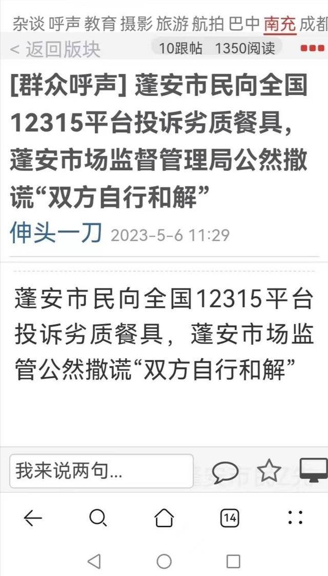 张先生再次在网上投诉,他先生认为,蓬安市场监管局对全国12315平台的结案反馈的就是一个货真价实的虚假反馈,根本没有把消费者的投诉当回事,敷衍塞责!“我吃饭的地方离市场监管局办公楼只有300多米,而且就是在3月15日当晚,他们对消费者还是这种态度!”接受封面新闻记者采访时,张先生还是一脸懵:我是投诉人,我怎么不知道是谁与谁的和解?