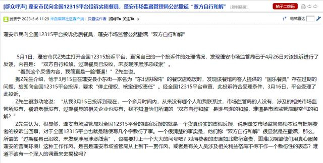 张先生在四川蓬安一家餐馆吃饭,发现餐具过期,遂向12315平台投诉。“五一”前,张先生在平台上看到回复:双方自行和解!5月9日,张先生在当地论坛再次投诉,称市场监管部门敷衍塞责,“没人和我联系过,我是和谁和解的?”