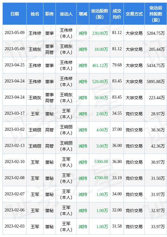 中际旭创近半年内的董监高及核心技术人员增减持详情如下: