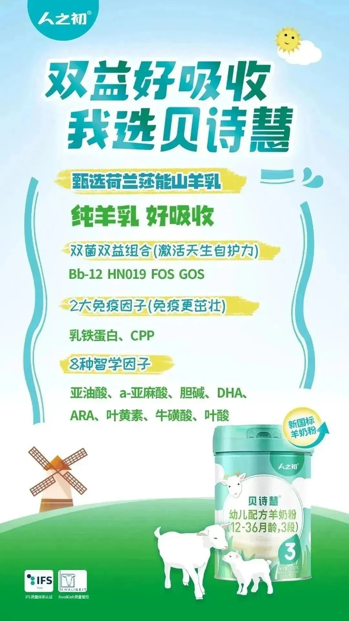 基于市场洞察,人之初全新布局羊奶粉,旗下贝诗慧羊奶粉将开辟羊奶粉新赛道、打响羊奶粉新征程,品牌、渠道全面进击,迎势而上,领跑新国标。