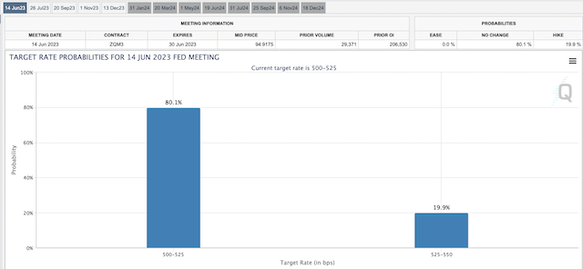 就在一周前,美联储实施了连续第十次加息,将联邦基金利率上调至15年高位5.00%~5.25%。截至第一财经记者发稿时,据芝商所利率观察工具(FedWatch Tool),市场押注6月14日按兵不动的概率为80.1%,加息25个基点至5.25%~5.50%的概率攀升至19.9%。