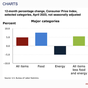此外,二手车和汽油价格也是推动通胀的动力,分别环比大涨4.4%和3%;整体能源价格在3月环比下跌3.5%之后,于4月反弹0.6%,与去年同期相比,能源价格下滑5.1%,食品价格则上涨7.7%(前值为8.5%)。