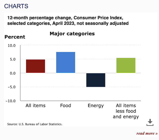 当地时间10日,美国劳工部发布最新数据,4月消费者物价指数(CPI)同比上涨4.9%,创2021年4月以来的最小涨幅,较前一月下滑0.1个百分点,也低于预期值5.0%。