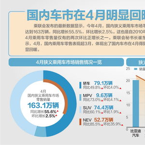 值得一提的是,眼下国内车市已出现明显回暖迹象。乘联会发布的最新数据显示,今年4月,国内狭义乘用车市场零售量达到163万辆,同比增长55.5%,环比增长2.5%。这也是自2010年以来4月乘用车零售量仅有的两次环比正增长之一。