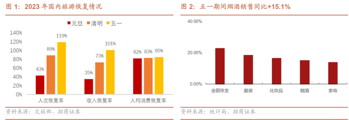 五一假期居民出行意愿强烈,消费市场升温,烟酒销售额同比增长15.1%。根据文化和旅游部数据,2023年五一假期全国国内旅游出游2.74亿人次,同比增长70.8%,按可比口径恢复至2019年同期的119.1%;实现国内旅游收入1480.6亿元,同比增长128.9%,按可比口径恢复至2019年同期的100.7%;据商务部监测,全国重点零售和餐饮企业销售额同比增长18.9%,其中烟酒销售同比增长15.1%;