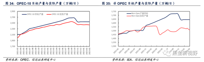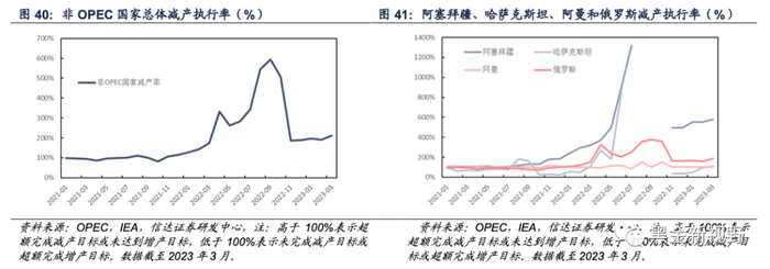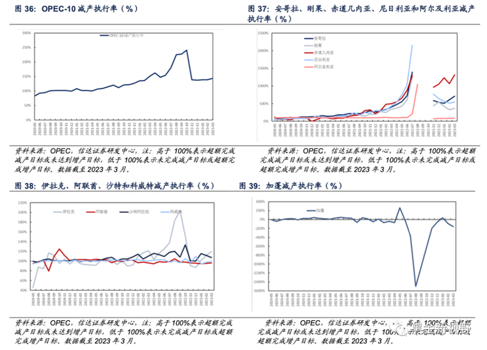 产量目标完成情况:2020年初受新冠疫情冲击,国际油价暴跌,为稳定原油市场,2020年5月OPEC+正式执行减产协议,油价企稳回升。随着疫情逐步缓解、原油需求逐步复苏,2021年3月起OPEC+开始执行增产,以使成员国原油生产恢复到疫情前水平,增产计划在2022年8月结束。根据原油市场情况,2022年9月,OPEC+决议在当年8月产量目标基础上继续增产10万桶/日。2022年10月,OPEC+决议在当年9月产量目标基础上减产10万桶/日。2022年11月,OPEC+决议在当年8月产量目标基础上大规模减产200万桶/日,减产计划执行至2023年12月。2023年4月,以沙特为代表的部分OPEC+国家宣布自愿减产合计165万桶/日,减产时间为2023年5月至12月。