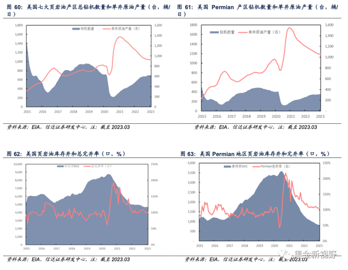 库存井方面:2023年3月,美国库存井(DUC)数量为4676口,环比减少10口,总完井率为101.01%,环比持平。其中,Permian地区库存井数量为761口,环比减少32口,地区完井率为107.41%,环比上升1.20pct。