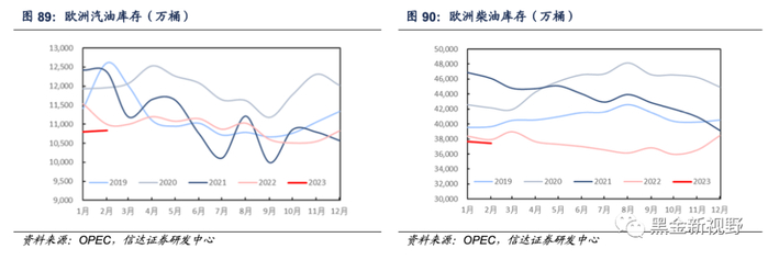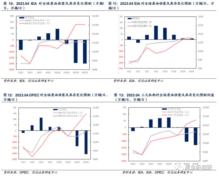 对于2023Q2,IEA、EIA和OPEC预测全球原油库存或将分别-36.05、+42.12、-1.75万桶/日,三大机构预测库存平均+1.44万桶/日。