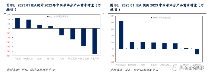 中国来看,据IEA统计,2022年中国原油需求增量主要来自化工用油,受严峻疫情形势影响,交通用油需求将下降。IEA在2023年4月报中统计,2022年中国柴油、汽油、航空煤油需求较2021年分别增加10.80、减少14.40、减少23.10万桶/日;化工品板块,2022年石脑油、LPG和乙烷需求分别较2021年增加22.60、17.30万桶/日。