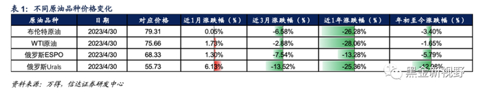 截止2023年4月30日,布伦特原油、WTI原油、俄罗斯EPSO原油、俄罗斯Urals原油价格分别为79.31、75.66、68.33、55.73美元/桶,近一个月主要油品涨跌幅分别为:布伦特原油(+0.05%)、WTI原油(+1.73%)、俄罗斯ESPO(+1.30%)、俄罗斯Urals(+6.13%)。2023年年初至今不同油品涨跌幅分别为:布伦特原油(-3.40%)、WTI原油(-1.65%)、俄罗斯ESPO(-5.79%)、俄罗斯Urals(-12.98%)。