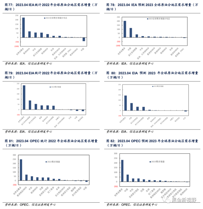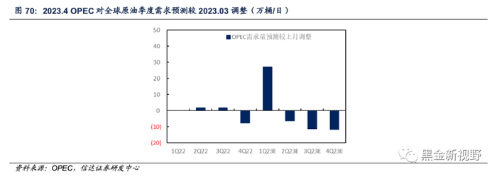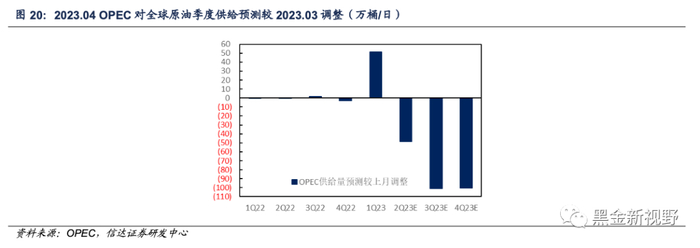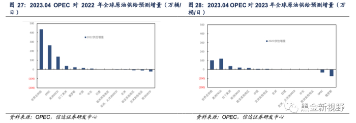 具体来看,2023年4月IEA、EIA和OPEC预测2023Q2全球原油供给或将分别同比+222.87、+237.34、+192.46万桶/日,相较2023年3月预测量分别-71.84、-16.04、-48.42万桶/日。