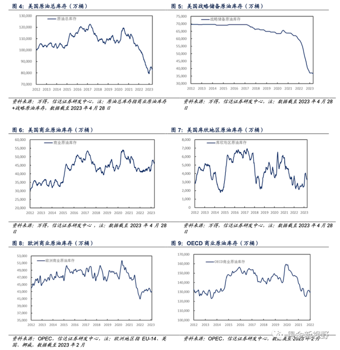 考虑2023年2月欧盟对俄罗斯的油品制裁落实、OPEC从2022年11月持续至2023年12月的减产和2023年4月宣布的自愿减产、美国原油产量增速有限,三大机构均预测2023年全球原油供给增长有限。对于需求端,IEA和OPEC认为2023下半年全球原油需求仍保持强劲增长,EIA则认为2023下半年全球原油需求很可能受经济衰退影响而增长相对有限。因此,IEA和OPEC预期2023年全球原油为去库存趋势,EIA则认为2023年全球原油或将出现累库。