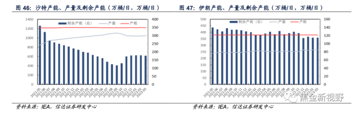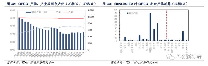 根据IEA 2023年4月报披露数据,2023年3月OPEC+合计剩余产能为543万桶/日,环比增加35万桶/日。其中,OPEC-13国剩余产能为461万桶/日,主要集中在沙特、阿联酋和伊朗,三国剩余产能分别为177、78、115万桶/日;非OPEC国家剩余产能为82万桶/日,主要集中在俄罗斯,其剩余产能为62万桶/日。