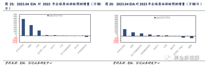 EIA在2023年4月报中表示,2022年全球原油供给增量主要集中在OPEC和美国。EIA预计2023年全球原油供给增量集中在美国等美洲OECD国家,以及以巴西、圭亚那为代表的非OECD国家,而受欧盟禁运和价格上限影响,前苏联地区原油供给出现下降,受减产影响,OPEC供给也出现下滑。