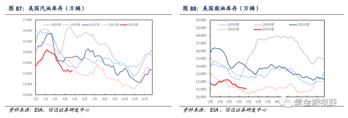 2023年4月,美国、欧洲的汽、柴油库存仍处于历史低位水平。截至2023年4月底,美国汽油、柴油库存分别为22287.8、11032.3万桶;欧洲汽油、柴油库存分别为10830、37460万桶;新加坡汽油、柴油库存分别为1706、904万桶。随着夏秋季欧美出行高峰来临,成品油需求季节性提升或将进一步拉动原油需求。