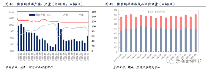 产量方面:2023年3月,俄罗斯原油产量为958万桶/日,环比减少29万桶/日,原油剩余产能为62万桶/日,环比增加29万桶/日。