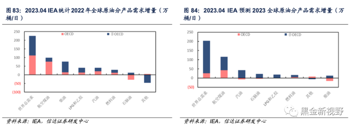 IEA统计2022年航空煤油和柴油作为需求增量贡献主力,需求复苏增量主要来自OECD国家。据IEA 2023年4月报,成品油板块内,2022年航空煤油、柴油、汽油需求分别增加98.40、76.40、40.00万桶/日。化工品板块内,2022年LPG和乙烷、石脑油需求分别增加40.30、减少16.70万桶/日。