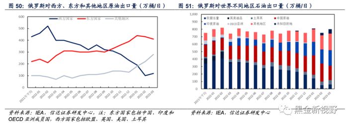 贸易流向方面:2023年3月,俄罗斯对西方国家石油(原油+石油产品)出口数量为120万桶/日,环比增加20万桶/日;对东方国家石油(原油+石油产品)出口数量为410万桶/日,环比减少20万桶/日;对其他地区/未知目的地的出口量为280万桶/日,环比增加60万桶/日。