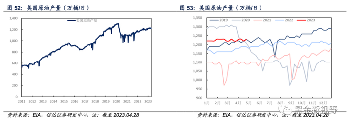 EIA在2023年4月报中统计,预计2023年美国原油产量为1253.8万桶/日,较2022年增加65.7万桶/日,较2023年3月预测上调9.7万桶/日;预计2024年美国原油产量为1274.9万桶/日,较2023年增加21.1万桶/日,较2023年3月预测上调12.0万桶/日。
