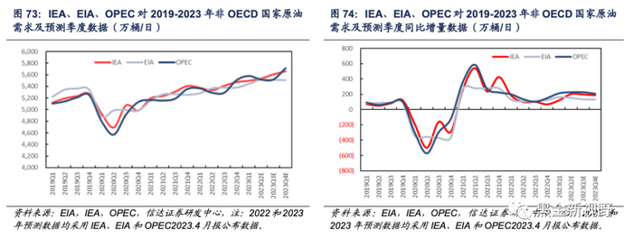 据IEA、EIA和OPEC预计2023年非OECD国家需求预期仍保持增长态势,或将超过2019年疫情前水平。据IEA、EIA和OPEC 2023年4月报预期,2023年,非OECD国家原油需求分别+176.4、+143.3、+218.1万桶/日至5572.7、5492.5、5579.8万桶/日,较2022年原油需求增量112.4、117.4、136.3万桶/日分别增加64.0、25.9、81.7万桶/日,有望超过2019年疫情前需求水平。