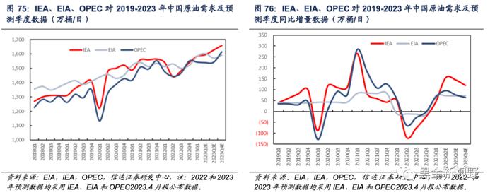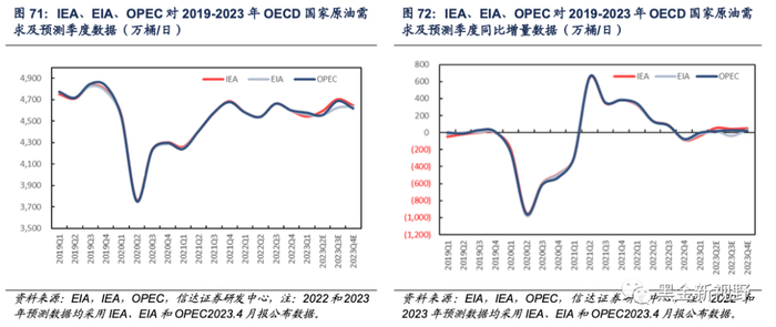 具体来看,2023年4月IEA、EIA和OPEC预测2023Q2全球原油需求或将分别同比+254.61、+168.43、+241.30万桶/日,相较2023年3月预测量分别-5.79、+10.06、-6.40万桶/日。