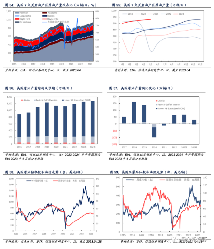 产量方面:2023年4月,美国原油产量平均1228万桶/日,较2023年3月减少5万桶/日。其中,七大页岩油产区总产量为928万桶/日,环比增长6万桶/日,Permian地区页岩油产量为568万桶/日,环比增长2万桶/日。