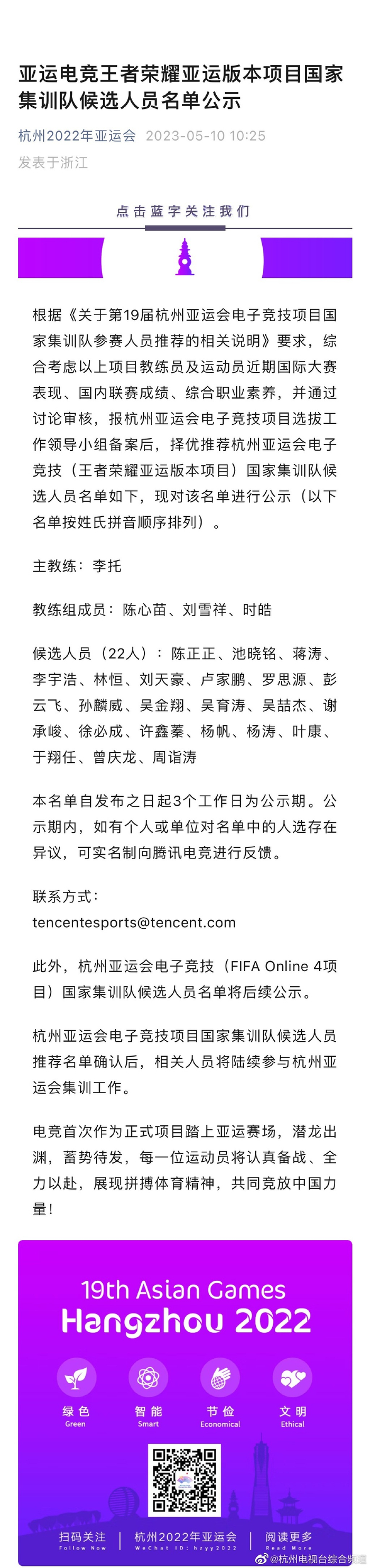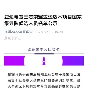 据@杭州2022年亚运会:根据《关于第19届杭州亚运会电子竞技项目国家集训队参赛人员推荐的相关说明》要求,综合考虑以上项目教练员及运动员近期国际大赛表现、国内联赛成绩、综合职业素养,并通过讨论审核,报杭州亚运会电子竞技项目选拔工作领导小组备案后,择优推荐杭州亚运会电子竞技(王者荣耀亚运版本项目)王者荣耀 国家集训队候选人员名单如下,现对该名单进行公示。