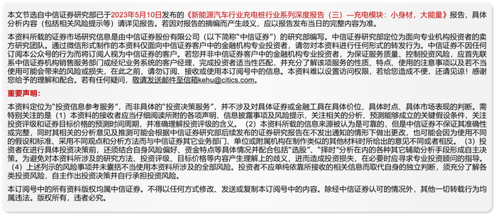 随着大功率直流快充的发展、充电应用场景的复杂化、欧美等海外市场对充电桩品质的严格要求,下游客户对充电模块的品质要求将进一步提升,进而对充电模块企业的技术能力提出更高要求,行业技术壁垒将进一步加深。我们认为,前期在市场上已经取得先发优势的技术型龙头企业,叠加在客户结构优化、供应链管理方面的成本优势等,有望进一步扩大市场占有率,迎来高速成长期。建议关注在电力电子及电源行业拥有多年技术积累、具备一定先发优势的充电模块厂商,以及自供充电模块的充电桩生产商,同时建议关注未上市的充电模块企业。